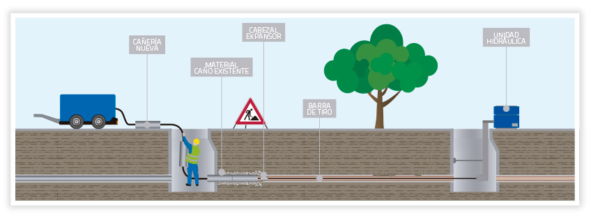 Sistema dinámico de sustitución/renovación de tubería (Cracking). Con el sistema dinámico, compuesto por un cable de tiro, máquina neumática y un expansor vibratorio con cabezal de rotura, se rompen las tuberías existentes de agua, gas y/o desagües que son incrustadas en el terreno, dejando el túnel libre para instalar la tubería nueva con igual o mayor diámetro, preferentemente de PEAD.