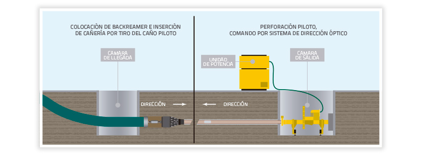 De esta manera y con la inyección de agua a presión dosificada con aditivos y bentonita, el backreamer rotativo produce la perforación en el suelo, el cual se convertirá en fluido y correrá en el espacio anular generado entre la excavación y la cañería que se está instalando, hasta la cámara de llegada en donde es retirado.