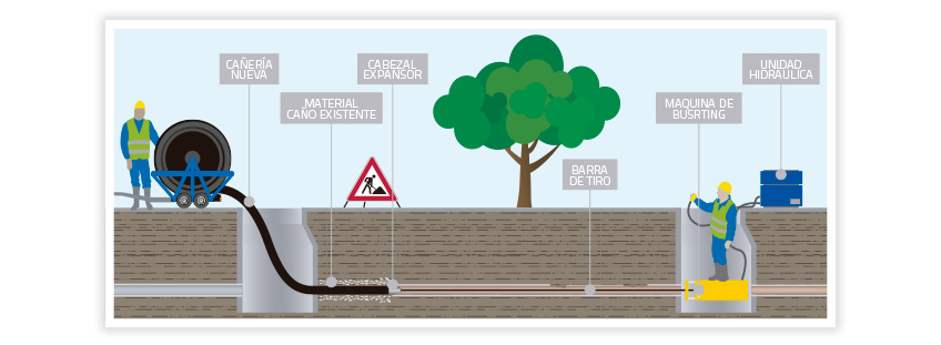 En el sistema estático, una máquina hidráulica ubicada en el pozo de salida del tramo a renovar, empuja un sistema de barras de acero por el interior de la cañería existente, hasta llegar al pozo de entrada en el extremo opuesto, donde se instala el cabezal de expansión o cuchilla de corte, al cual se conecta el portatubo de acero donde se acopla el tubo de PEAD.