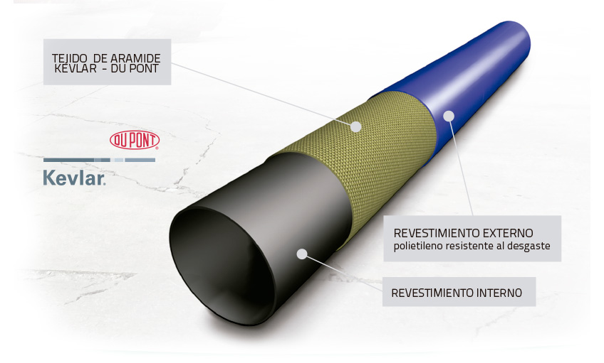 La capa intermedia es la conformada por el tejido de aramide (kevlar) en una o varias capas, dependiendo de la resistencia a la presión interna que se quiera alcanzar.